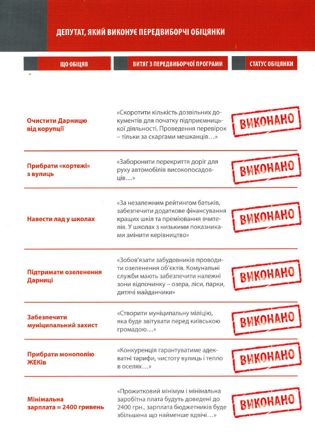 Более того, если верить агитке, в Киеве уже появилась муниципальная милиция. «Обещание: создать муниципальную милицию, которая будет подотчетна перед киевской общиной выполнено», утверждает депутат. Как известно, что инициатива о создании муниципальной милиции была озвучена нынешним летом руководителями столичной администрации, но позже глава КГГА Александр Попов заявил, что муниципальная милиция пока остается только в планах.