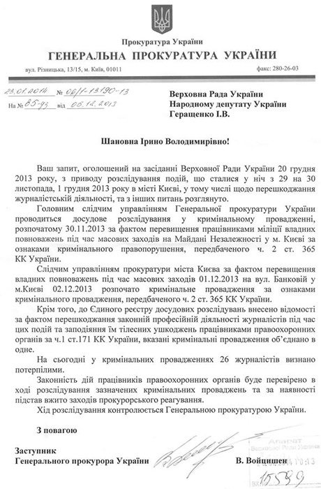 Об этом заявила депутат от «УДАРа» Ирина Геращенко, обнародовав ответ ГПУ на ее депутатский запрос, сообщает «Украинская правда».