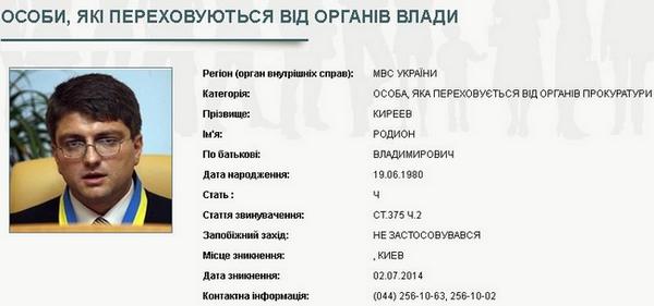 МВД Украины вслед за прокуратурой объявило в розыск судью Родиона Киреева, который вынес приговор по «газовому делу» экс-премьеру Юлии Тимошенко. Официальная информация о розыске появилась на сайте МВД Украины в разделе «лица, которые скрываются от органов прокуратуры».