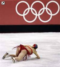 Во время соревнований по фигурному катанию в Турине в программе танцы на льду фигуристы один за другим обрушивались на лед. Напомним, что золото выиграли российские фигуристы Татьяна Навка и Роман Костомаров. Серебро досталось американцам Танит Белбин и Бенжамин Агосто. Бронзу получили украинцы Елена Грушина и Руслан Гончаров.
