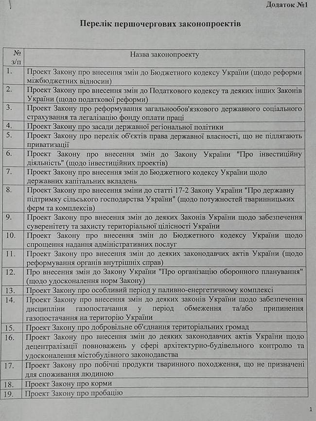 Кроме того, к тексту соглашения прилагается перечень первоочередных законопроектов, которые должна утвердить новая парламентская коалиция.