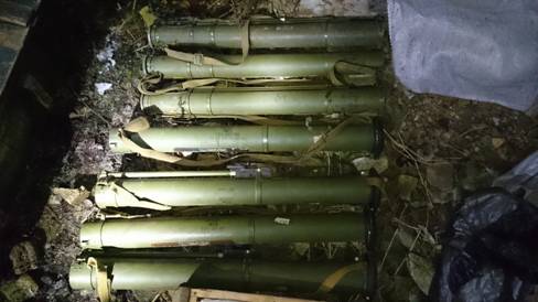 Из тайника сотрудники СБУ изъяли гранатометы РПГ-18, около двух десятков гранат, дымовые шашки, цинка с патронами различного калибра. Также были обнаружены самодельные взрывные устройства, начиненные гвоздями и резаным проводом для усиления поражающих действия. Наряду с оружием в тайнике была скрыта агитационная продукция антиукраинского содержания, последний тираж газеты «Новороссия», флаги России и фейковых «Киевской народной республики».