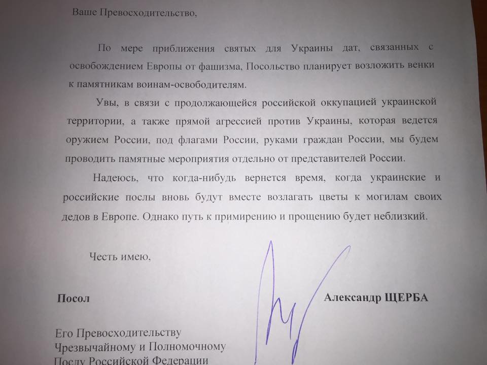 «По мере приближения святых для Украины дат, связанных с освобождением Европы от фашизма, посольство планирует возложить венки к памятникам воинам-освободителям. Увы, в связи с продолжающейся российской оккупацией украинской территории, а также прямой агрессией против Украины, которая ведется оружием России, под флагами России, руками граждан России, мы будем проводить памятные мероприятия отдельно от представителей России», — говорится в ответе Щербы на имя посла РФ в Австрии.