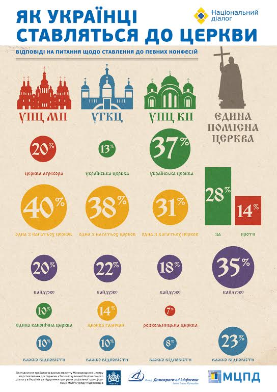 Идея создания Единой Поместной Православной Церкви находит поддержку на Западе Украины: на Волыни, Галиции, Юго-западе. В остальных регионах преобладает безразличное или неопределенное отношение, но и негативное отношение к этому тоже незначительно. В целом по Украине поддерживают идею создания единой Поместной Православной Церкви 28%, выступают против 14%, относятся равнодушно 35% и еще 23% определенного мнения нет.