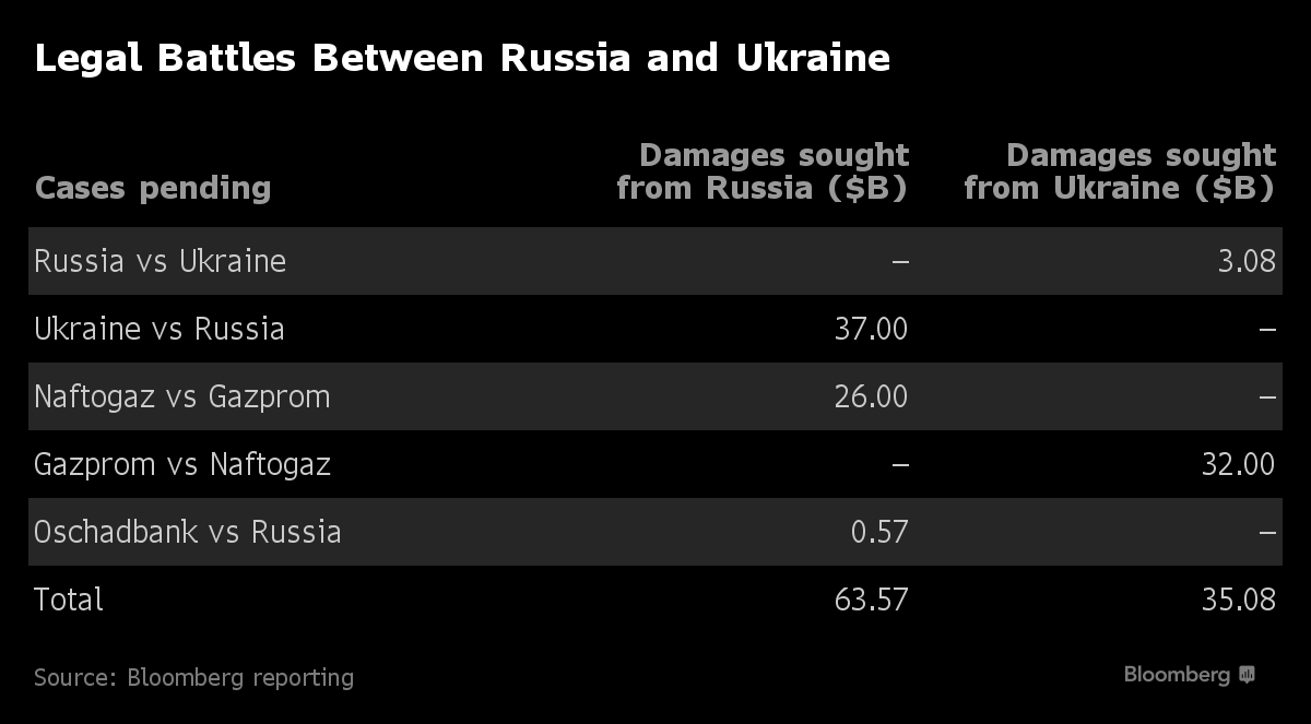 На сегодняшний день Украина требует от России выплаты более $63,5 млрд (основная часть этих средств — компенсация за аннексию Крыма — $37 млрд), в свою очередь, РФ хочет взыскать с Украины $35 млрд.