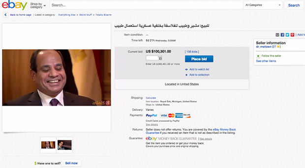 Президента Египта Абделя Фаттаха ас-Сиси решили продать на интернет-аукционе. Лот появился на eBay поле его заявления о том, что он на столько заинтересован в разрешение долгового кризиса в стране, что может даже продать себя, если это поможет.