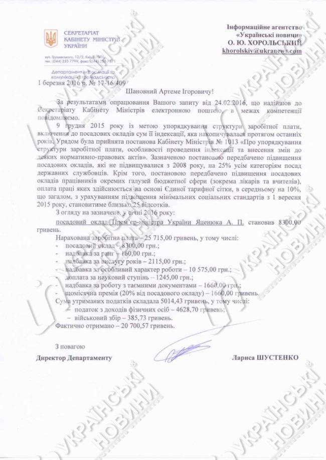 Согласно документу должностной оклад Яценюка в январе составил 8,3 тыс. гривен, а насчитанная зарплата 25 715 гривен.