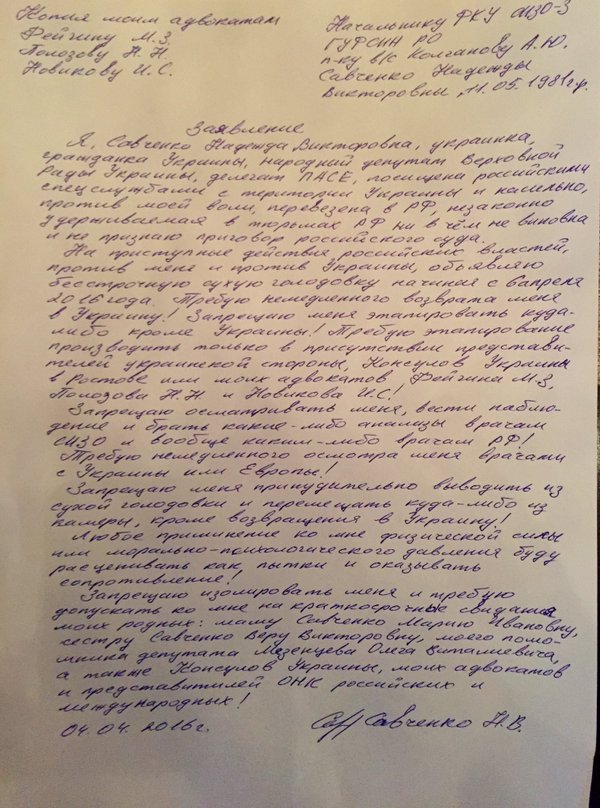 «На преступные действия российской власти против меня и против Украины объявляю бессрочную сухую голодовку, начиная с 6 апреля 2016 года. Требую немедленного возвращения меня в Украину! Запрещаю меня этапировать куда-нибудь, кроме Украины... Запрещаю принудительно выводить меня из сухой голодовки, а также перемещать из камеры куда либо, кроме Украины», – говорится в заявлении.