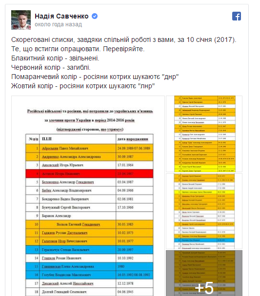 Как сообщала «Фраза», 10 января 2017 года народный депутат Украины Надежда Савченко обнародовала списки удерживаемых в заложниках на неподконтрольных властям Украины территориях Донбасса, а также в российских тюрьмах и в оккупированном Россией Крыму украинских политзаключенных. При этом она объяснила, что это нужно делать для того, чтобы «их можно было найти».