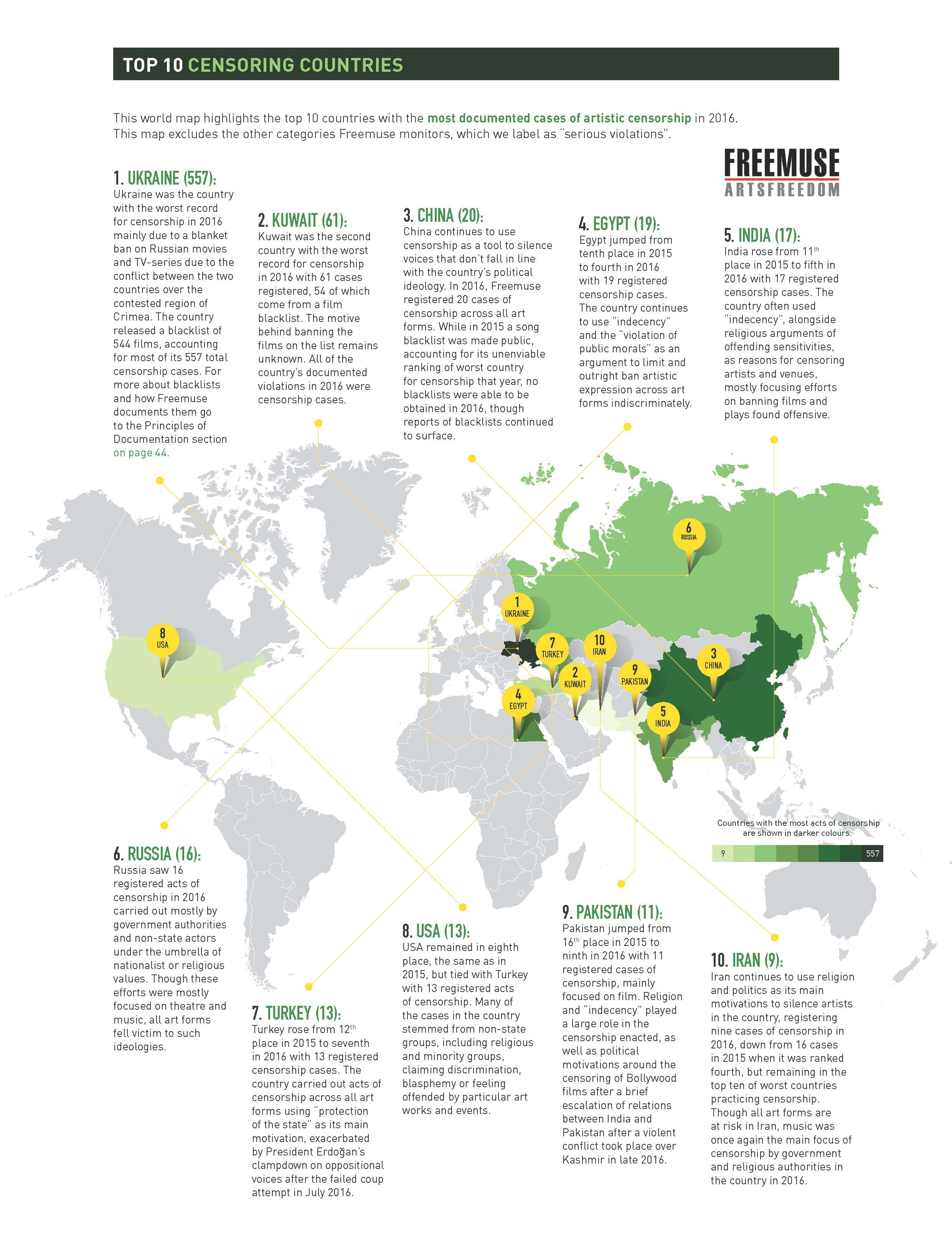 Украина оказалась государством, хуже всех обеспечивающим свободу творчества из-за большого числа официально зарегистрированных «актов цензуры» - речь идет о «черном списке» запрещенных к показу фильмов и сериалов преимущественно российского производства, составленном из-за продолжающего на востоке страны конфликта между двумя странами. Из-за этого на долю Украины 66% от всех зарегистрированных случаев введения цензуры за 2016 год – 557 из 840.