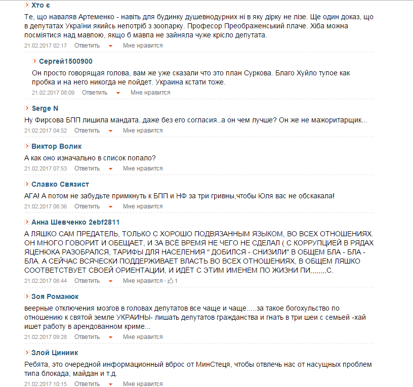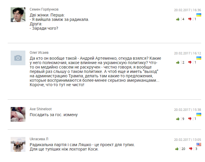 Лидер Радикальной партии Украины Олег Ляшко: «Если Артеменко не сложит депутатский мандат, мы собираем заседание фракции и будем рассматривать вопрос, я буду рекомендовать исключить Артеменко из фракции за предательство украинских интересов. В связи с заявлениями Артеменко должно быть возбуждено уголовное дело по посягательству на территориальную целостность Украины».