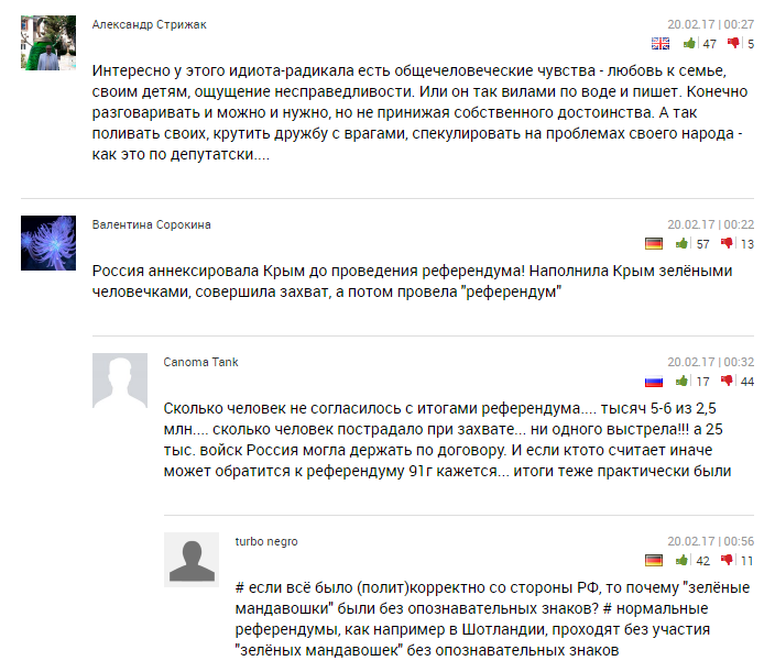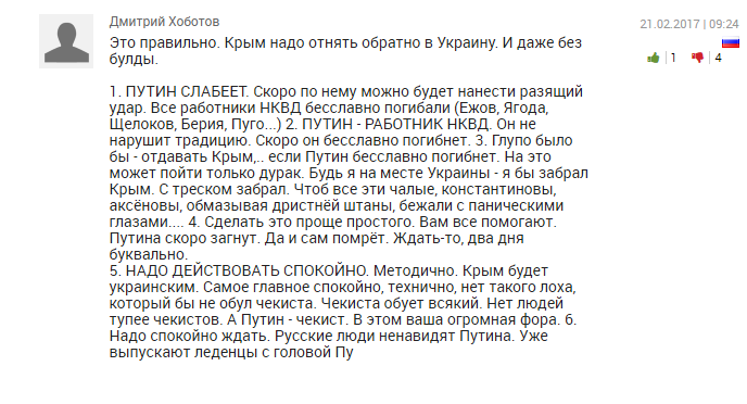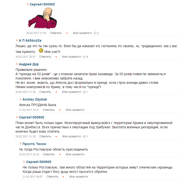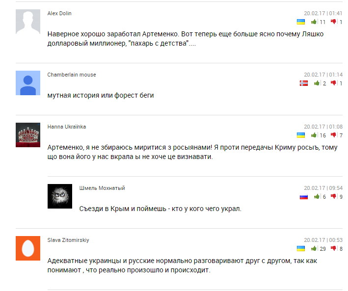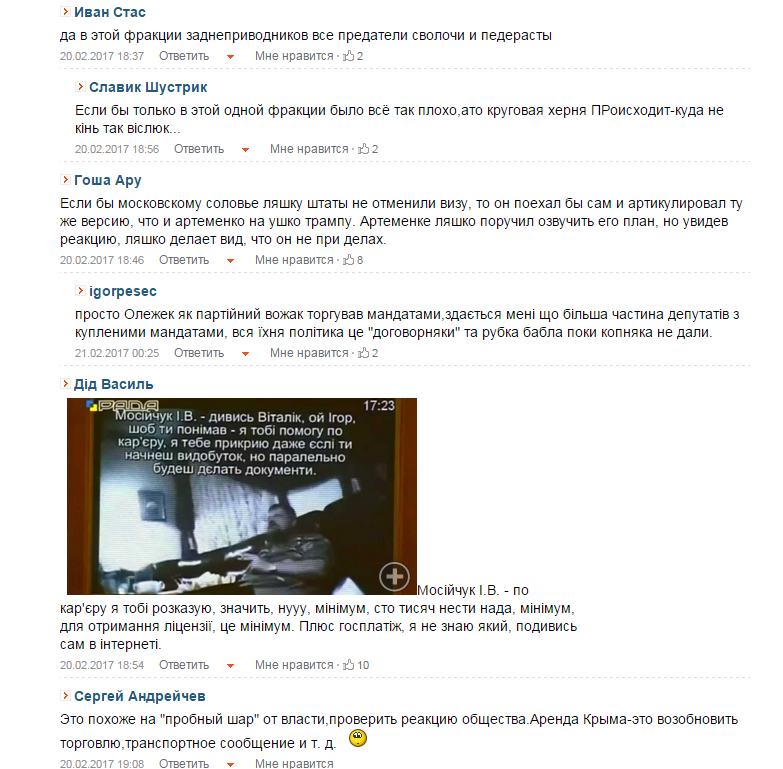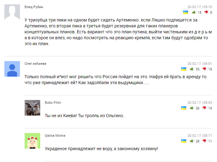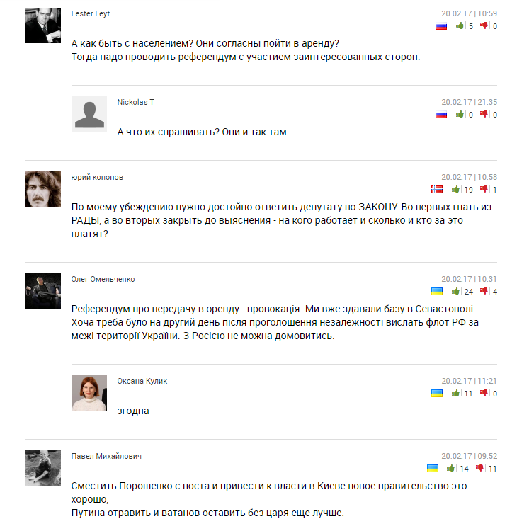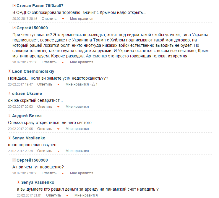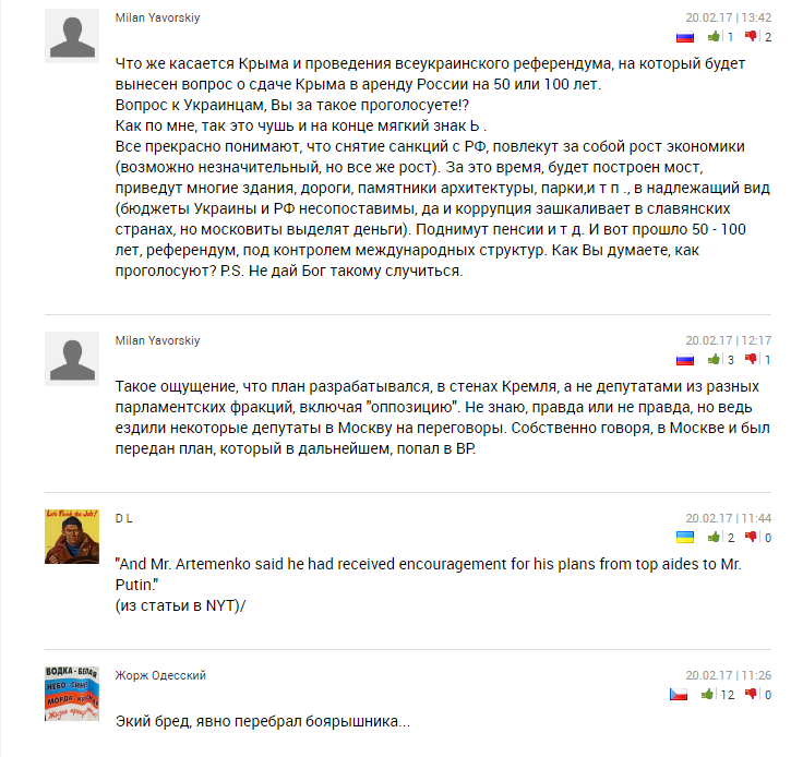 Министр внутренних дел Арсен Аваков: «Депутат Артеменко, предлагающий отдать Крым в аренду России — безответственный маргинал. Прав Ляшко — этого представителя Левочкина надо отправлять из парламента Украины — в аренду, например — политическим пионерам пиндостана».
