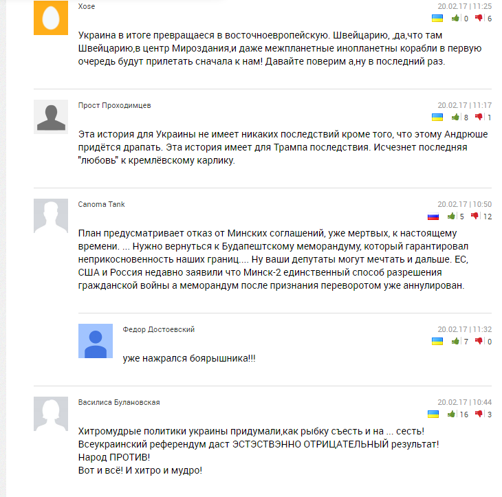 Вадим Карасев, директор Института глобальных стратегий: «Серьезно к этому документу не стоит относиться. Но следует серьезно отнестись к тому, что депутаты в индивидуальном порядке начинают проводить свою дипломатию. В индивидуальном порядке дипломатия не проводится, как это пытаются делать Надежда Савченко или Андрей Артеменко. Поэтому парламенту тоже, наверное, не помешало бы подключиться на уровне профильных комитетов к разработке контуров такого плана, а не просто констатировать, что Минские соглашения исчерпали себя».