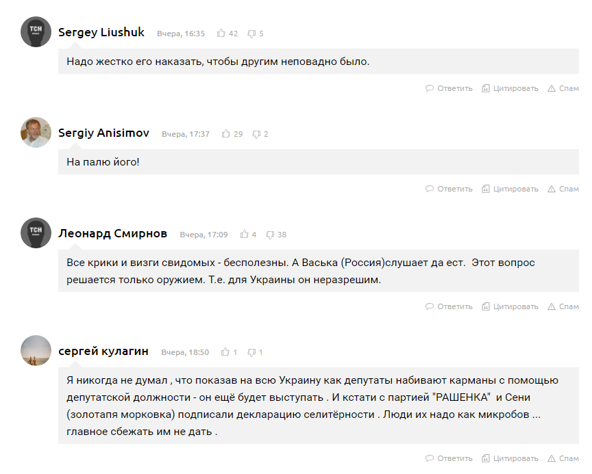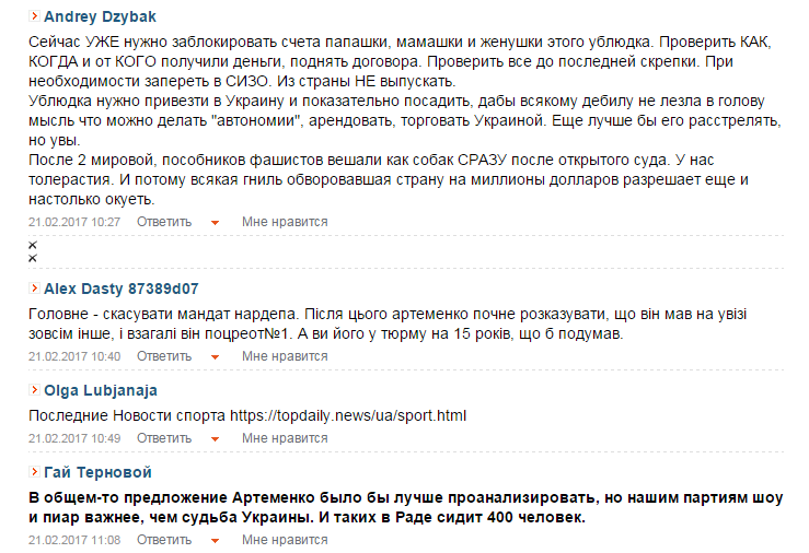 Украинский политолог, директор центра «Эйдос» Виктор Таран: «Действия Артеменко — это государственная измена. СБУ должна начать производство, подать в Раду представление о снятии депутатской неприкосновенности и привлечь Артеменко к уголовной ответственности».