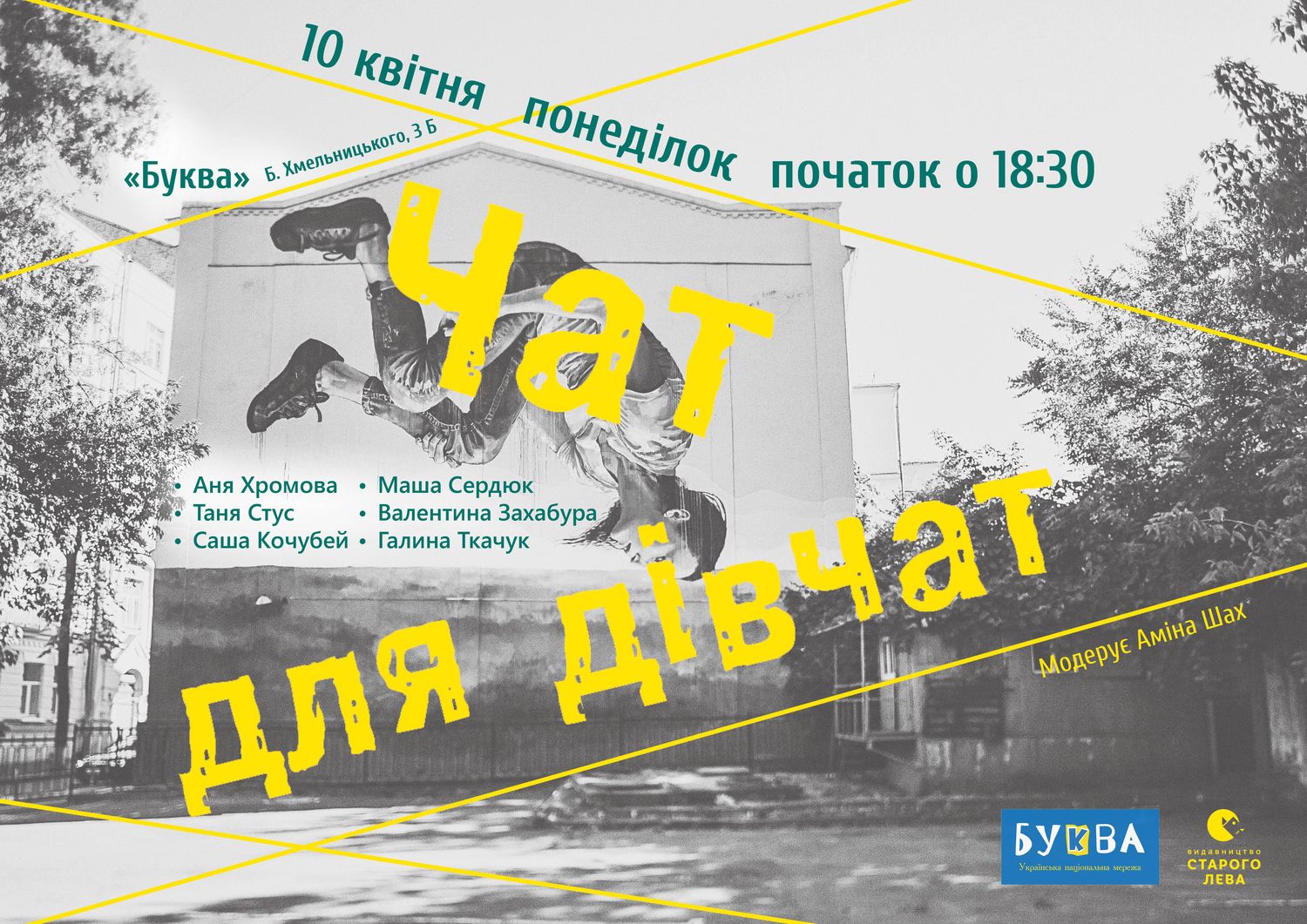 Разговор будет вести писательницы Анна Хромова, Татьяна Стус, Саша Кочубей, Мария Сердюк, Валентина Захабура, Галина Ткачук. Модерировать встречу будет Амина Шах. Вход свободный.