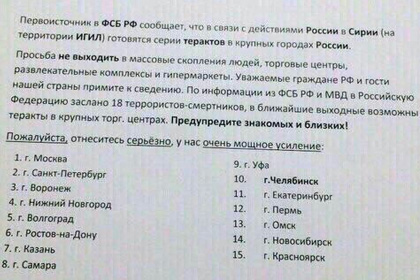 Как сообщает Lenta.ru со ссылкой на пользователей, получивших подобные сообщения, в них от имени «первоисточников в ФСБ РФ» указывается, что в связи с действиями России в Сирии в крупных городах готовится серия терактов, которую должны осуществить 18 смертников. Далее перечисляются населенные пункты, в которых ФСБ обещает провести «мощное усиление».