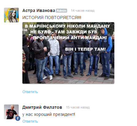 Журналист Станислав Речинский: "Сегодняшний день полезен для Порошенко. Судя по его речевым оборотам типа "моя армия", "мой план", "я,я,я....." -- у него развился комплекс мессии. А сегодняшний день разрушит, надеюсь, этот комплекс. Напомнит "царю", что его, собственно избрали не по любви или уважению, а по необходимости. Потому как нужно было быстро кого-то избрать для полноценного статуса государства -- не более. Вполне себе фиктивный брак и не нужно фантазировать. Лучше вовремя и тихо уйти".