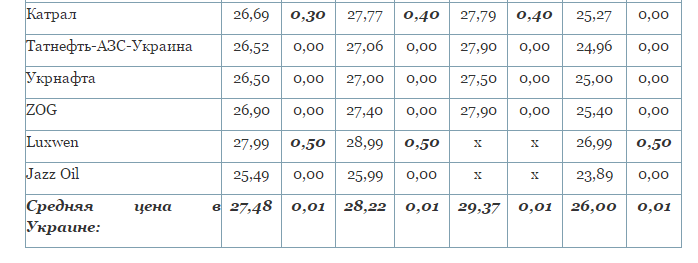 На 20-30 коп./л подорожали бензины и ДТ в сети KLO. Сети Marshal, «Фактор», «Катрал» и Luxwen повысили цены на 0,5-0,50 грн/л. В «А-95» отметили, что 26 декабря средняя стоимость бензинов марки А-92 и А-95 выросла на 1 коп./л — до 27,48 грн/л и 28,22 грн/л, соответственно. Бензин А-95+ и ДТ также подорожали на 1 коп./л — до 29,37 грн/л и 26,00 грн/л.