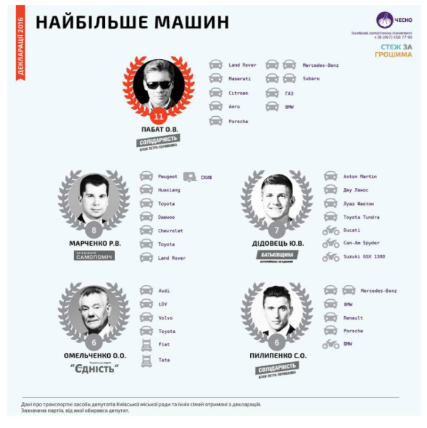 Общественная организация «Честно» составила рейтинг депутатов Киевсовета по количеству автомобилей, которые на них зарегистрированы. Как выяснили журналисты "Фразы", первое место занял депутат от БПП Александр Пабат — на него задекларировано 11 автомобилей.