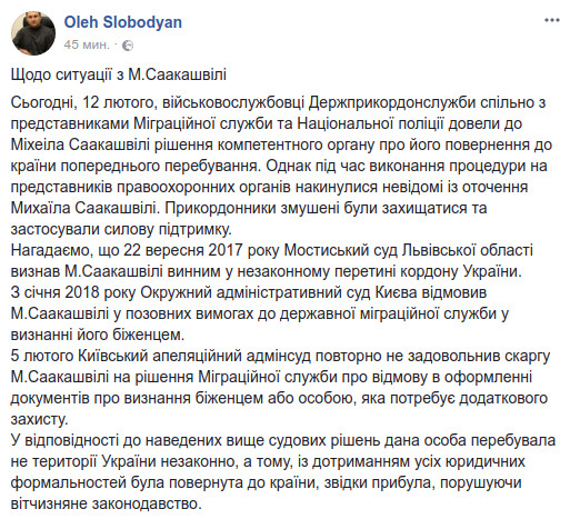 «Военнослужащие Госпогранслужбы совместно с представителями Миграционной службы и Национальной полиции привели к исполнению в отношении Саакашвили решение компетентного органа о его возвращении в страну предыдущего пребывания», — написал Слободян, добавив, что во время выполнения процедуры на правоохранителей набросились неизвестные из окружения Саакашвили и поэтому они вынуждены были защищаться и применили силовую поддержку.