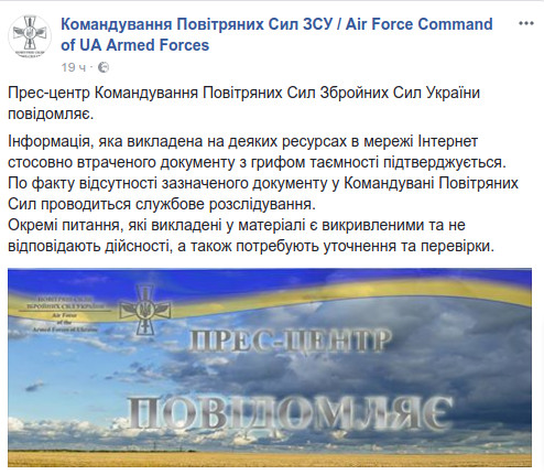 В частности, как сообщается, по факту отсутствия документа с грифом секретности в Командовании Воздушных сил проводится служебное расследование.