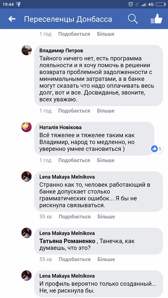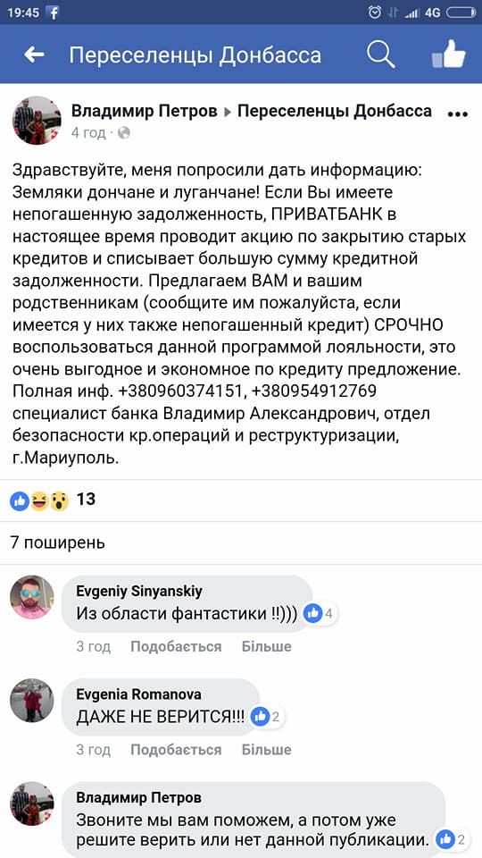 «Обнаружен сейчас аттракцион невиданной щедрости от якобы „сотрудника банка“, который всем с оккупированных территорий помогает кредиты „списывать“. По акции. По возможности, предупредите родных и знакомых, ну и сами никогда такому не верьте и не оставляйте подобным проходимцам никакой информации. Но его наглость в комментариях впечатляет, конечно», — написала Музычук и привела скрины объявлений одного из таких мошенников.
