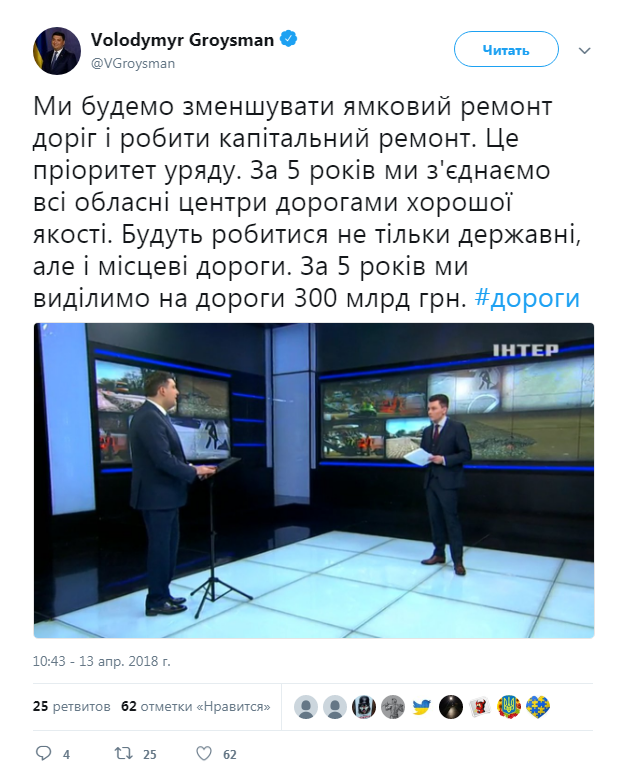 «Мы будем уменьшать ямочный ремонт дорог и делать капитальный ремонт. Это — приоритет правительства», — написал Гройсман, пообещав при этом, что за 5 лет все областные центры будут соединены дорогами хорошего качества.
