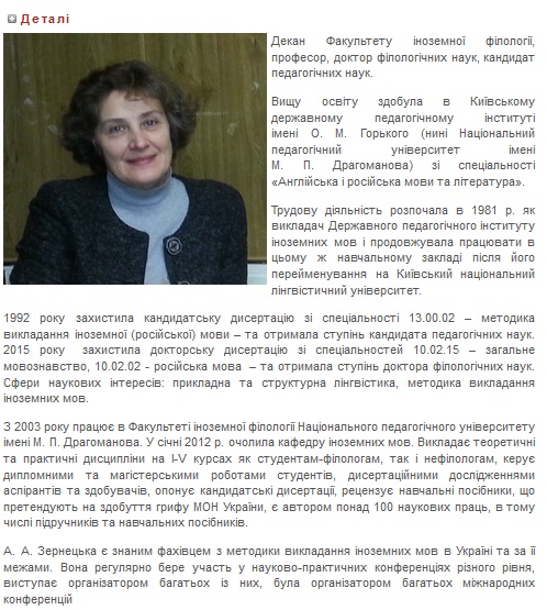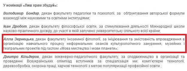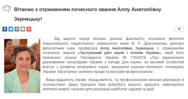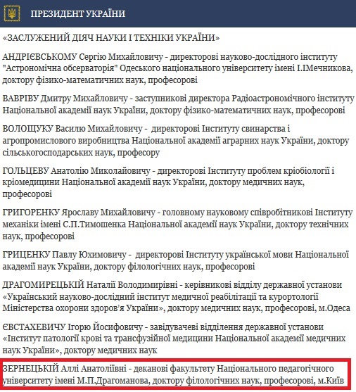 Среди награжденных указом лиц значится и Алла Зернецкая — доктор филологических наук, профессор, декан факультета Национального педагогического университета имени М.П. Драгоманова. Она была награждена званием «Заслуженный деятель науки и техники».
