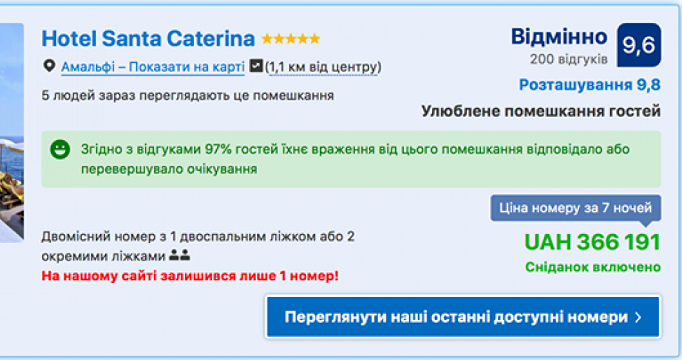 Сообщается, что, согласно сайту booking.com цена за семь ночей в августе в этом отеле начинается от 366 тысяч гривен.