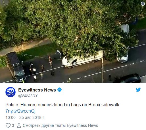 В пятницу, 24 августа, в Бронксе, Нью-Йорк, сотрудниками полиции были обнаружены человеческие останки в черных мешках. Как выяснили журналисты «Фразы», полицию вызвал уборщик парка Кротона, обративший внимание на подозрительные пакеты, оставленные на тротуаре.