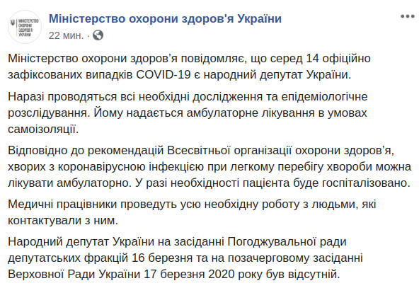 Информацию о заражении депутата также подтвердило Министерство здравоохранения на своей странице в Facebook.