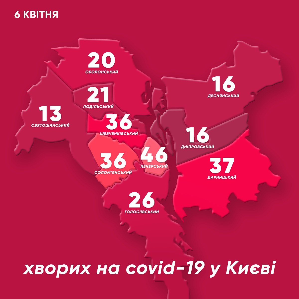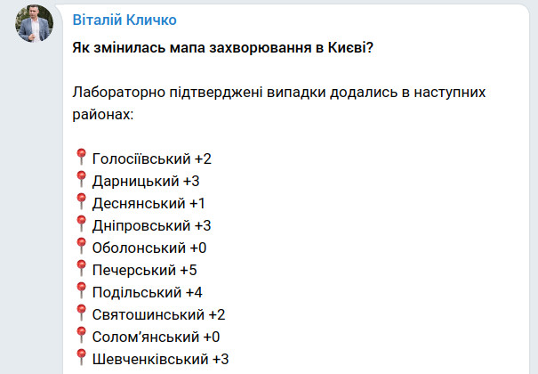 Наименее поверженным заболеванию на данный момент оказался Святошинский район, где зафиксированы лишь 13 случаев заражения (+2 за сутки).