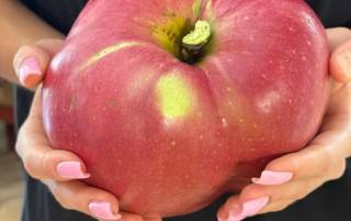 Яблоко-гигант весом в 1 килограмм 281 грамм имеет обхват 50 см. Чтобы ветка дерева выдержала, пришлось использовать подвязки и со всех сторон ставить подпорки.