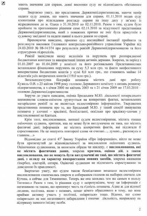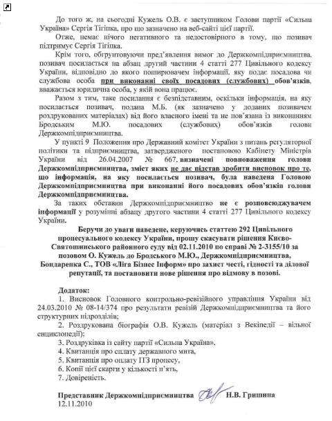 Апелляционная жалоба гласит следующее: «Решением Киево-Святошинского районного суда от 02.11.2010 по делу № 2-3155/10 по иску А. Кужель к Бродскому М.Ю., Госкомпредпринимательства, Бондаренко С., ООО «ЛигaБизнесИнформ» о защите чести, достоинства и деловой репутации частично удовлетворены исковые требования.