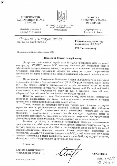 Кроме того, Министерство иностранных дел ранее заявляло, что якобы в связи с финансовыми проблемами не готово к введению системы централизованного оформления консульскими учреждениями Украины заграничных паспортов нового образца. Еще в апреле 2010 года консорциум «ЕДАПС» обратился к главе внешнеполитического ведомства с предложением оказать МИДу техническую помощь на сумму 8 000 000 гривен для установки необходимого оборудования и коммуникаций для полного завершения всех работ и обеспечения централизованного порядка паспортизации граждан Украины за рубежом. Перед этим, в 2008 году консорциумом «ЕДАПС» совместно с Министерством внутренних дел Украины провел работы по установке необходимого оборудования, адаптации программного обеспечения Государственной информационной системы (ГИС) и тестового подключения регионального центра МИД Украины к Главному вычислительному центру Государственной информационной системы МВД Украины. Это позволило начать работы по развертыванию системы для оформления машиносчитываемых загранпаспортов службами МИД Украины, как в Киеве, так и в заграничных дипломатических учреждениях.