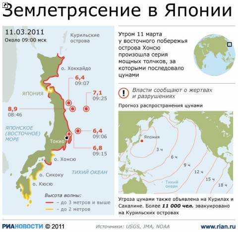 Два сильных землетрясения произошли 11 мартя, в пятницу, в Японии, подземные толчки ощущаются в Токио. Магнитуда землетрясения первого составила 8,9. Эпицентр землетрясения находился в 373 километрах северо-восточнее Токио, его очаг залегал на глубине 24 километров. Вскоре в том же районе произошло еще несколько мощных подземных толчков магнитудой свыше 6,0, эпицентр одного из них находился всего в 67 километрах от Токио. Магнитуда самого сильного афтершока составила 7,1.