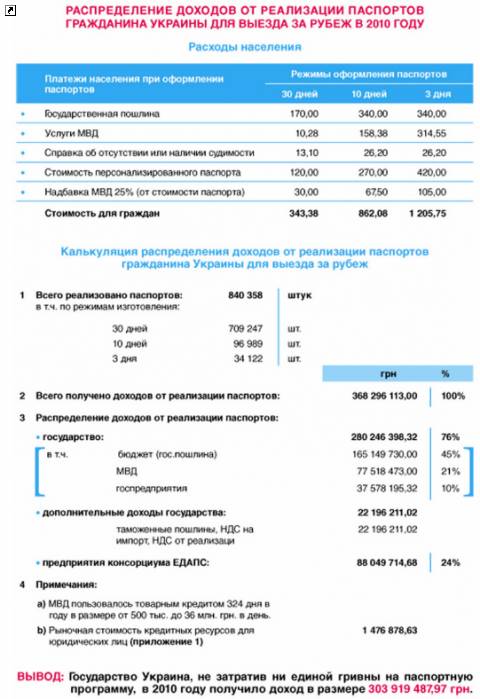 Е.П.: Мы не получаем денег из госбюджета и не паразитируем на бюджетных ассигнованиях. Это очень принципиальный момент. Кто в этом разбирается, меня поймет. Например, возьмем проект по производству загранпаспортов. Граждане, оформляя эти документы, полностью оплачивают государству их выдачу. Эти деньги идут в госбюджет и в специальный фонд МВД Украины. И только частью этих денег министерство рассчитывается с отечественными производителями за поставленную продукцию (см. таблицу «Распределение доходов от реализации паспортов гражданина Украины…» – Ред.).