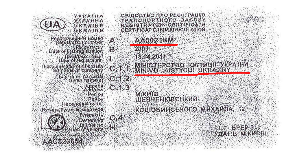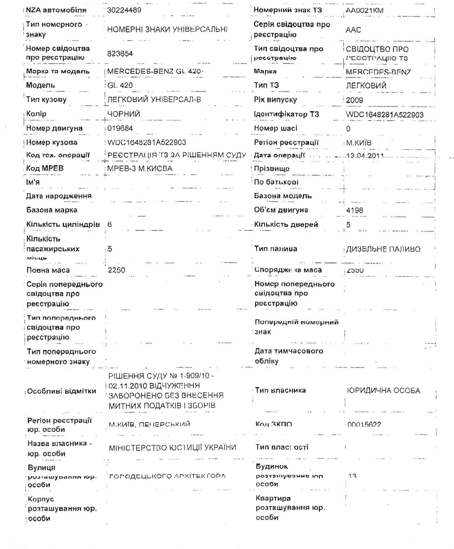 14 апреля 2011 года «Мерседес» GL 420 (номер кузова WDC1648281A522903) был зарегистрирован в ГАИ и выданы номера «АА 0021 КМ»