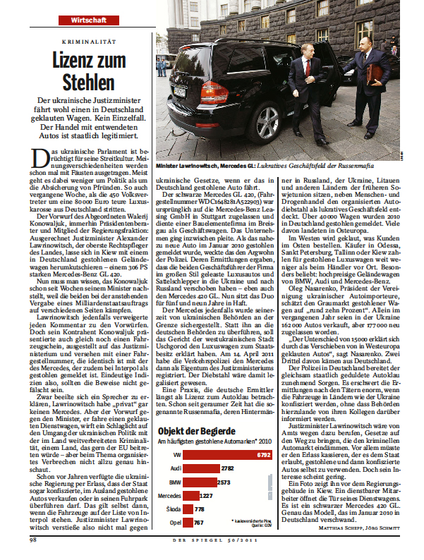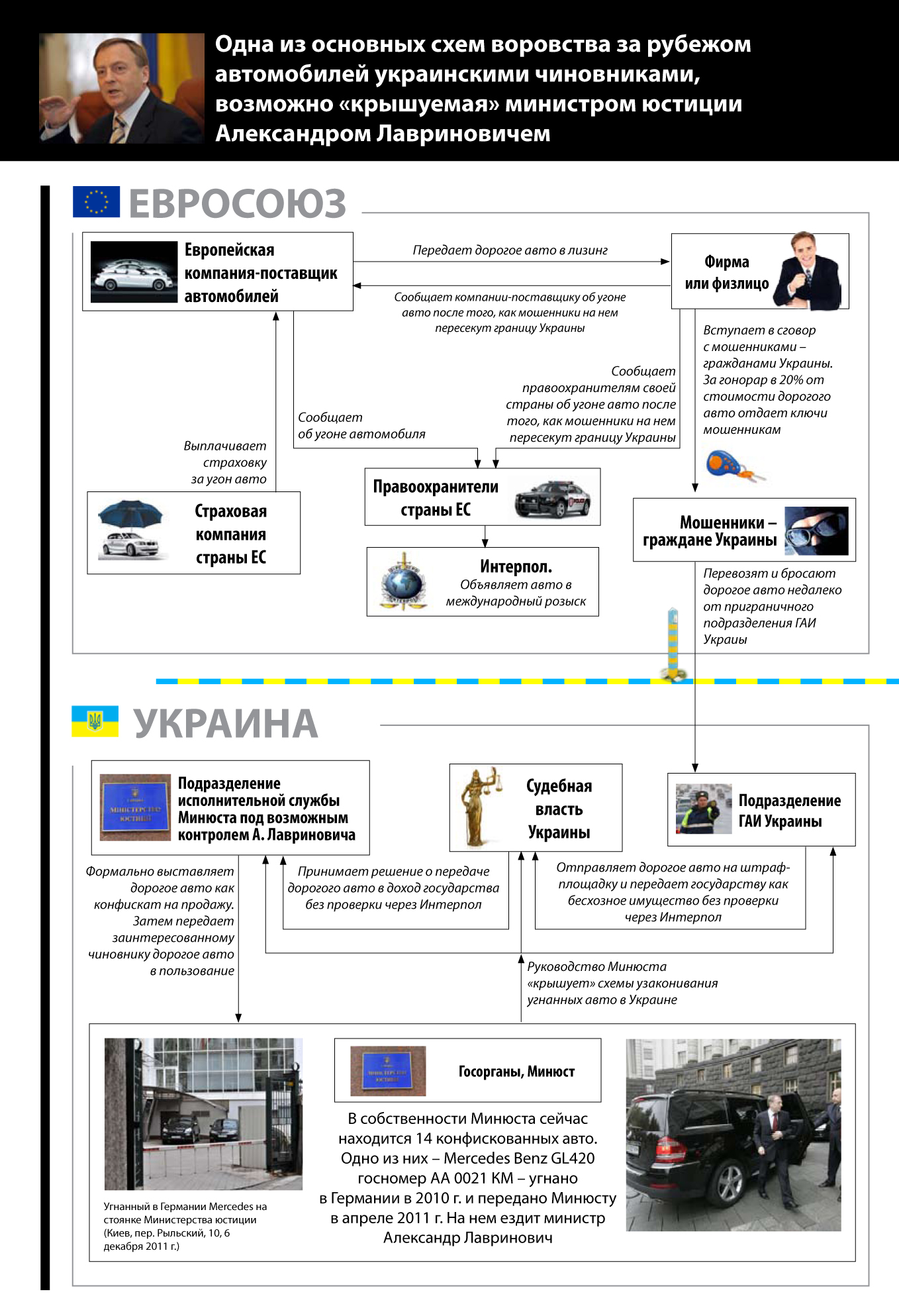 Учтите, что всемирно известные немецкие СМИ («Бильд», «Шпигель» и т.п.), публикуя информацию о махинациях Лавриновича, по европейской практике называют министров юстиции не иначе как верховный блюститель закона. Становится жутковато от таких «блюстителей» как Лавринович. Ведь, по информации того же Андрея Седова в гараже Минюста сейчас находится 14 авто и все конфискованные. Полагаем, что налогоплательщикам будет интересно узнать: какие авто стоят в гараже Минюста? Какая у них «родословная» то есть, каким образом они попали в собственность Минюста? Не были ли они украдены в Евросоюзе по типовой схеме? Напомним, «Багнет» уже описывал алгоритм воровства дорогих тачек из-за рубежа, с последующей их легализацией в Украине и передачей заинтересованному чиновнику (см. схему в конце статьи). Эту коррупционную пирамиду предположительно «крышует» именно Лавринович.