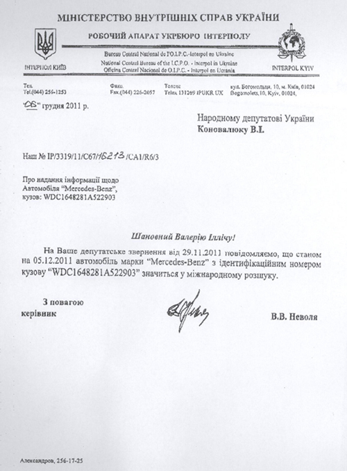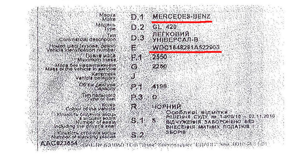 1. Автомобиль «Мерседес» GL 420 госномер АА 00 21 КМ (номер кузова WDC1648281A522903) был сворован в Германии в 2010 г. и объявлен в международный розыск.