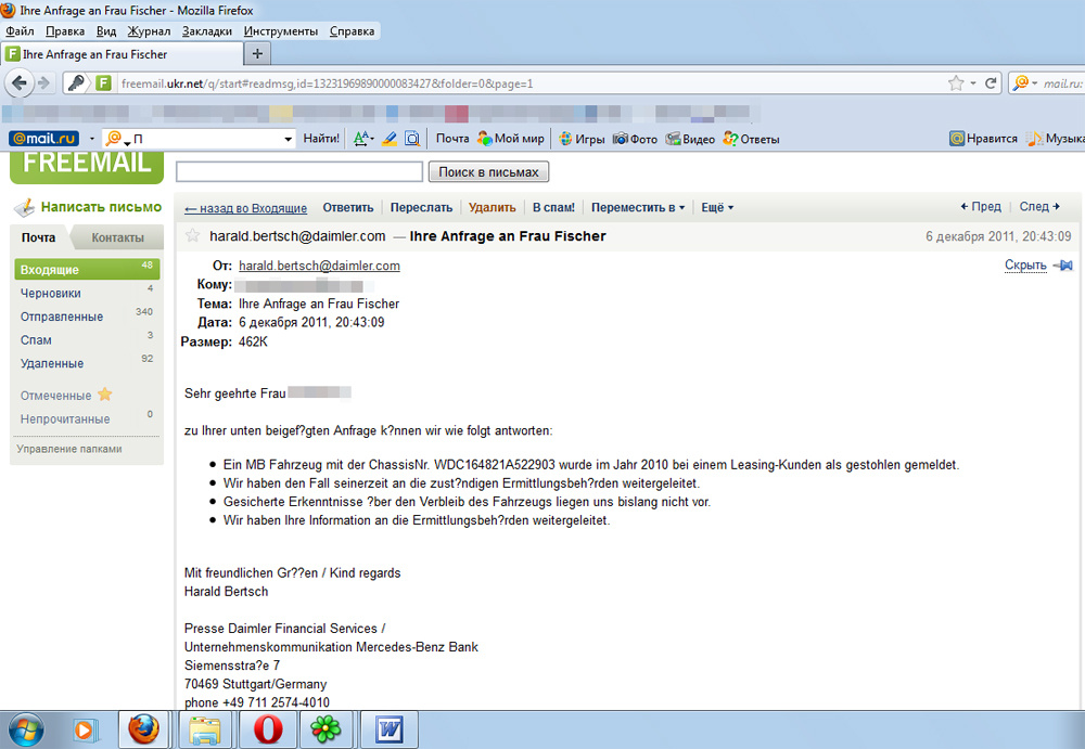 Лизингодатели «Mercedes Benz Leasing Gmbl» в Германии подтверждают, что автомобиль «Мерседес» GL 420 (номер кузова WDC1648281A522903) числится в угоне. Он был взят у компании в лизинг немецкой фирмой LIRu Gmbh, руководителями которой являются некие Александр Руди и Эдуард Лиске. После получения автомобиля в лизинг LIRu Gmbh объявила о банкротстве.