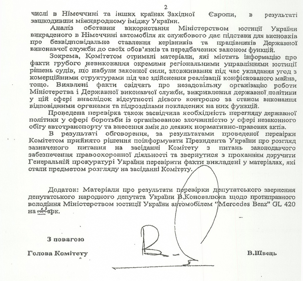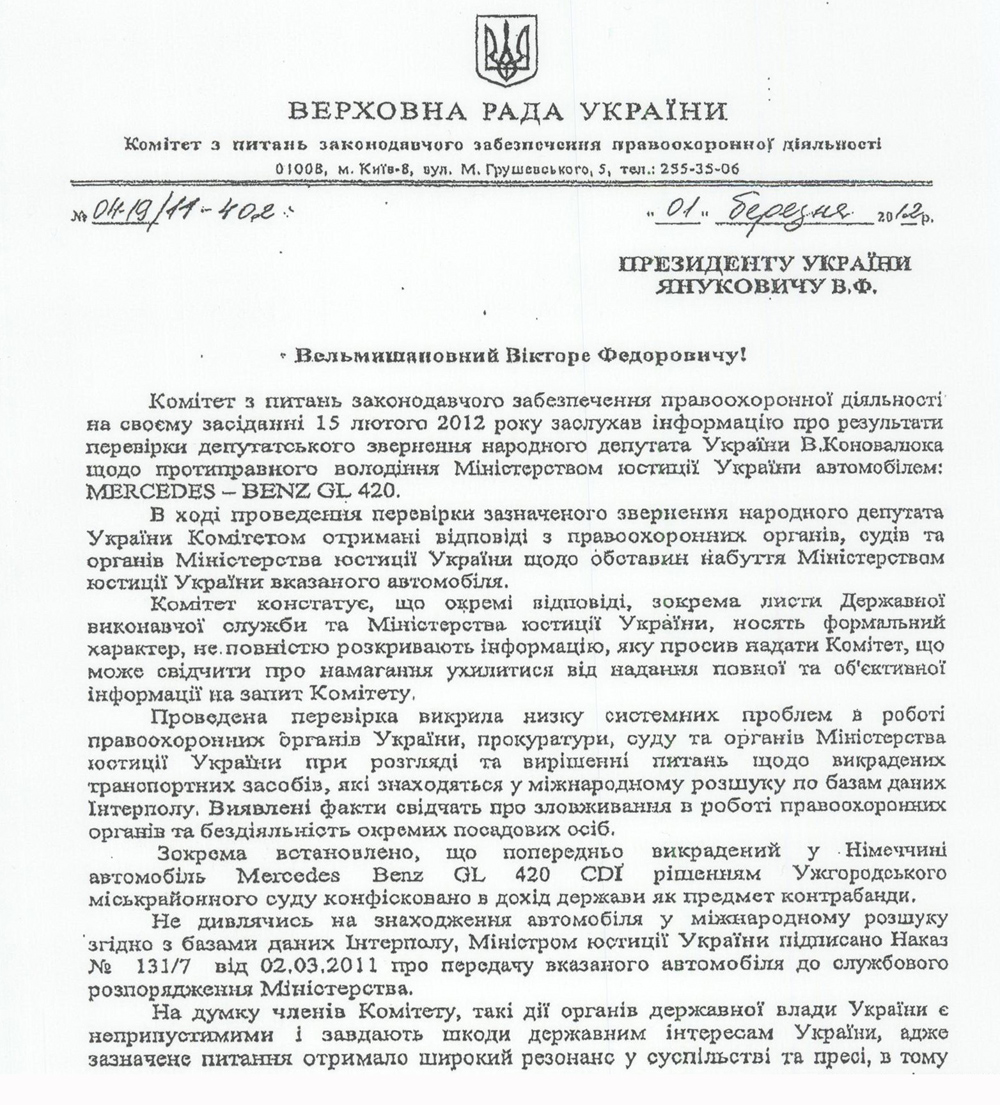 Парламентский комитет по вопросам законодательного обеспечения правоохранительной деятельности проинформировал Президента Украины Виктора Януковича о результатах проверки насчет противоправного владения Минюстом автомобилем «Мерседес», ранее угнанном в Германии. (см.документ)