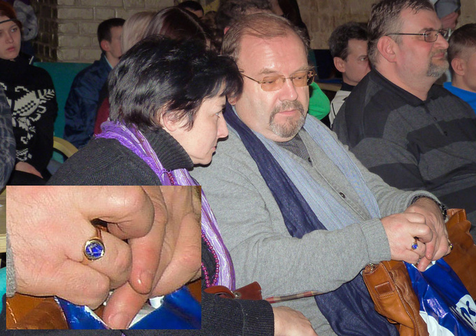 Известный в городе историк и писатель Евгений Горбуров не только преподает в университете им. В.А.Сухомлинского, но и, похоже, вовлечен в движение масонов, если носит перстень с их основной символикой.