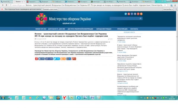 Обратите внимание на время новости. 5 утра. Поднятый по тревоге админ размещает эту новость. Вернее не новость, а заключение, что самолет сбит, коварно и цинично (так буквально). Самолет, напомню, еще толком не догорел, солнце не взошло, а уже все всем известно. УЧИТЕСЬ, ЖУРНАЛЮГИ, КАК НАДО РАБОТАТЬ!