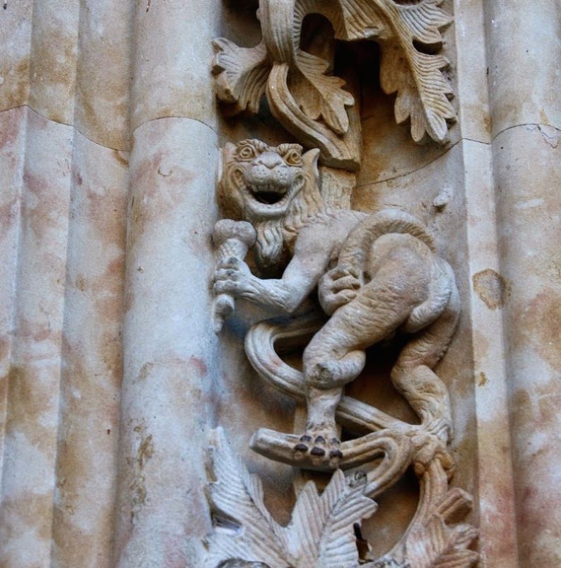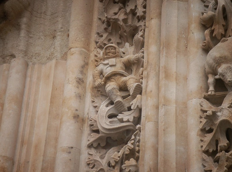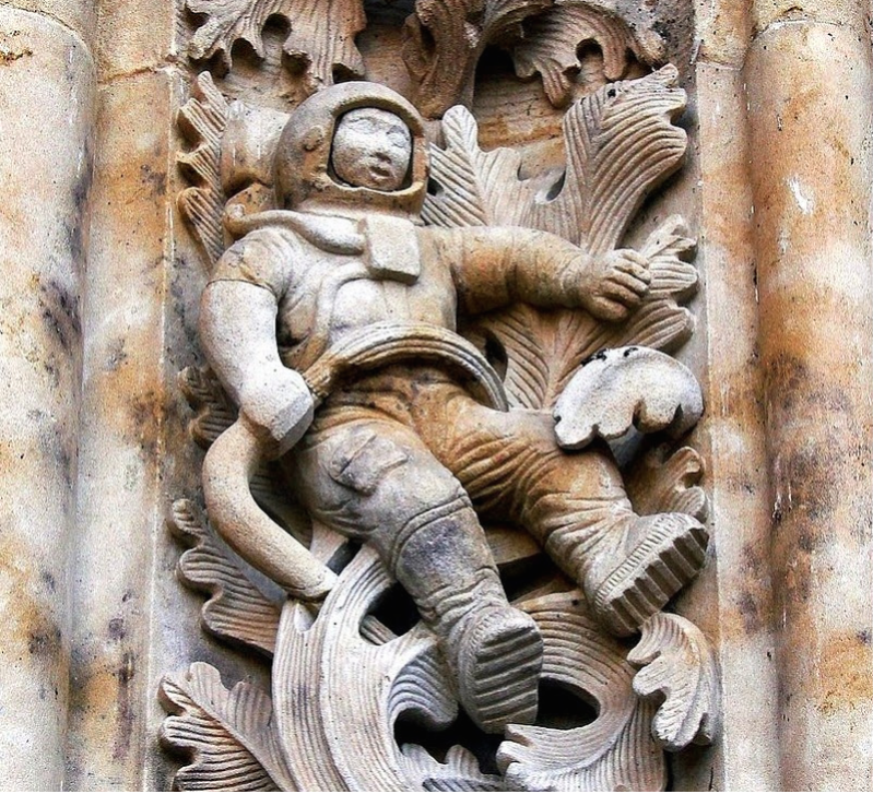 Фигурка астронавта на фасаде храма в Саламанке, Испания.