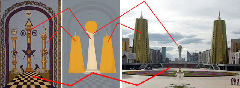Если посмотреть с другого ракурса, то на место Байтерека встанет монумент «Казак Елi» который очень похож на колонну с масонской схемы, плюс над ней появится пирамида которая так же видна на масонской схеме.