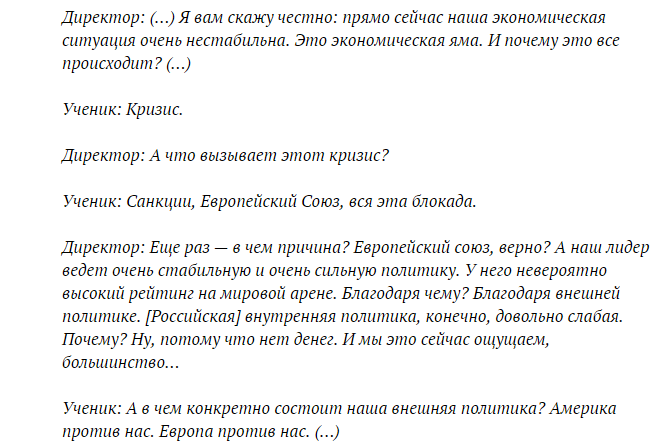 Факт того, что Россия ощущает экономические затруднения, нашел отражение в недавнем разговоре между директором и учениками русской школы в Брянске, городе в 400 к юго-западу от Москвы. Дискуссия началась в связи с появлением 50-минутного видео Алексея Навального на YouTube, посвященного имуществу Дмитрия Медведева.