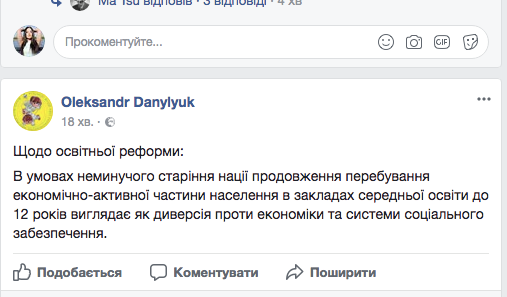 «Реально на сегодняшний день нет предпосылок для того, чтобы увеличивать на год срок пребывания обучения в средней школе. Авторы ссылаются на западный опыт, но даже в европейских странах в одних странах дети учатся 12 лет, в других — 11. В Чехии учатся 11 лет, во Франции школу заканчивают в 16-17 лет и эти страны достаточно успешно готовят свои кадры. Я знаю, что многие из коллег посетили районные, областные конференции учителей, участвовавших в торжественных линейках, общались и с родителями, и учителями. Скажите, кто у вас просил поддерживать увеличение учебы до 12 лет? Давайте не делать из школы брачное агентство, давайте дадим возможность детям продолжить профессиональное обучение после 11 лет в школе», — призывал коллег по парламенту депутат от Радикальной партии Игорь Попов, но голосов для сохранения в школах 11-летки не хватило.