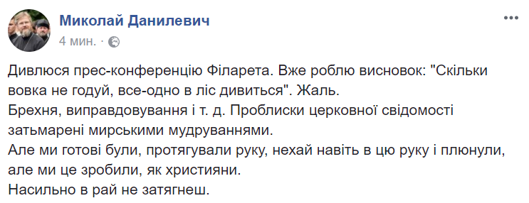 «Смотрю пресс-конференцию Филарета. Уже делаю вывод: „Сколько волка не корми, все равно в лес смотрит“. Жаль.