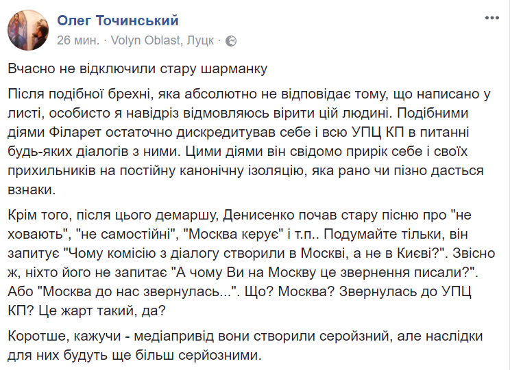 15:03 Глава Волынской епархии УПЦ МП Олег Точинский ставит крест на диалоге с Филаретом.